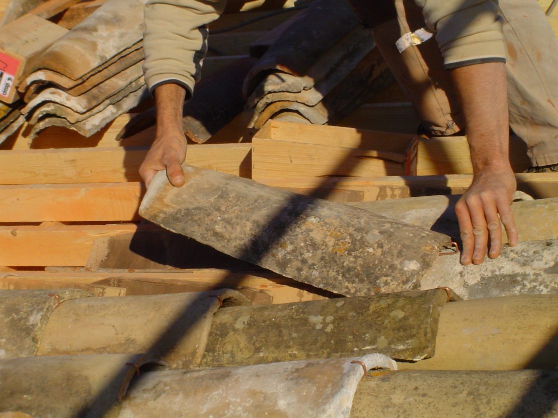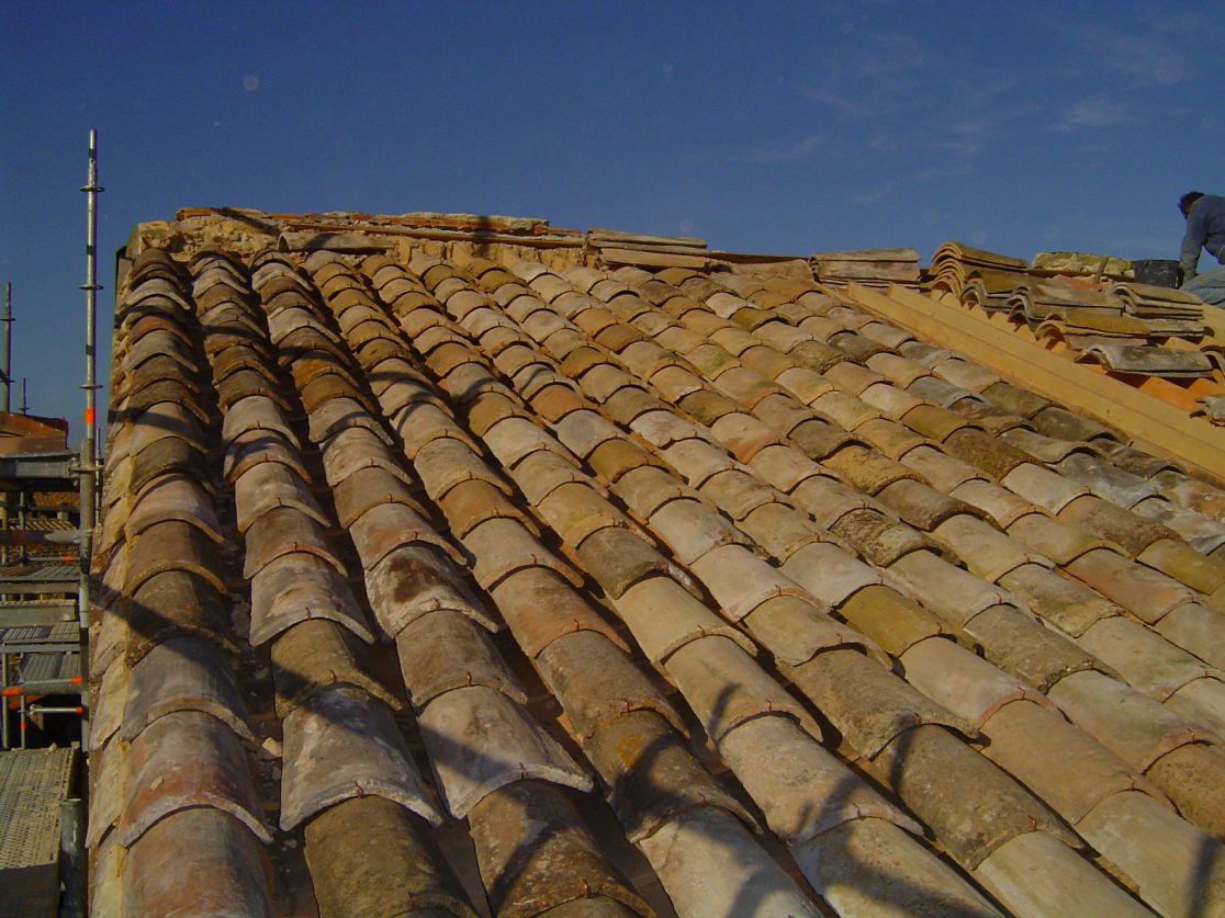 pose d’écran sous toiture,tuiles neuves à tétons en canal, avec tuiles de récupérations en dessus, fixées par crochets tempête en cuivre.
