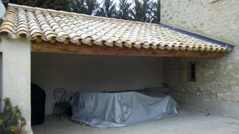 Auvent : couverture dite »Couverture sur Quess » avec tuiles neuves vieillies en courant et récupération en dessus collées.